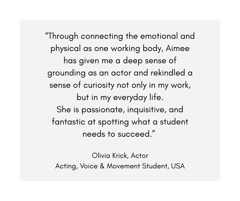 As an acting coach, Aimee specializes in integrating voice, body, and imagination into cohesive, playable choices. Her coaching supports actors at every stage of development—from pre-professional training to seasoned performers preparing auditions, roles, or public-facing performance work.